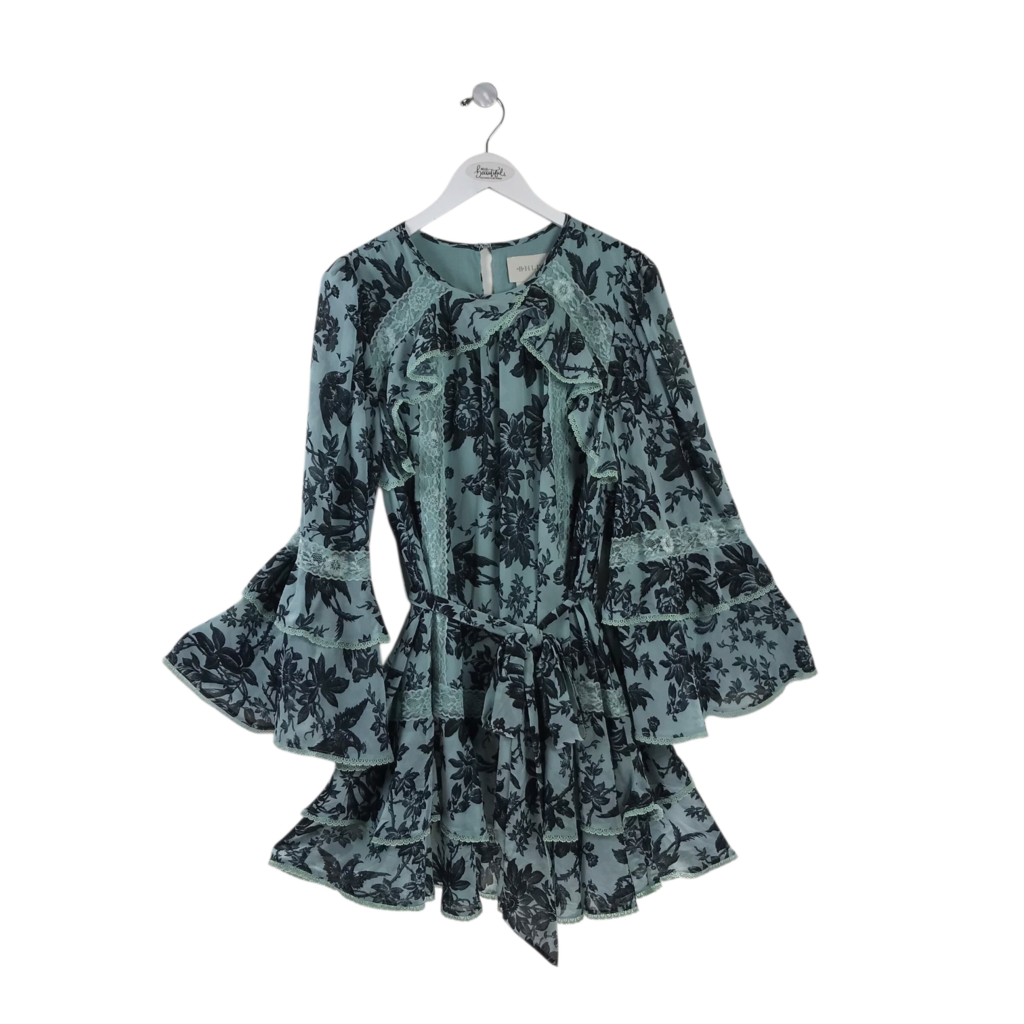 BHLDN RET$298 FLORAL BELL SLEEVE DESIGNER DRESS BLUE BLACK LARGE
