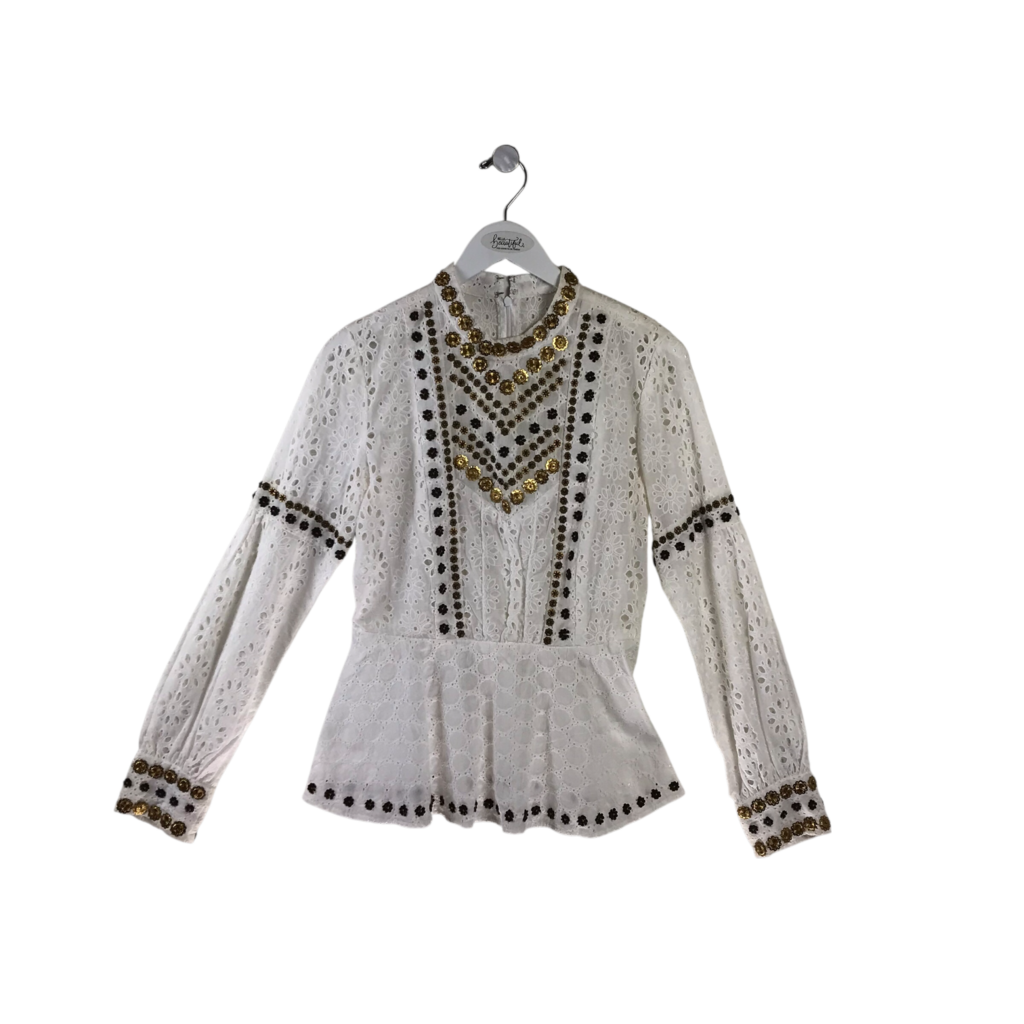 ANNA SUI EYELET FLORAL BEADS DESIGNER TOP WHITE BRONZE 8