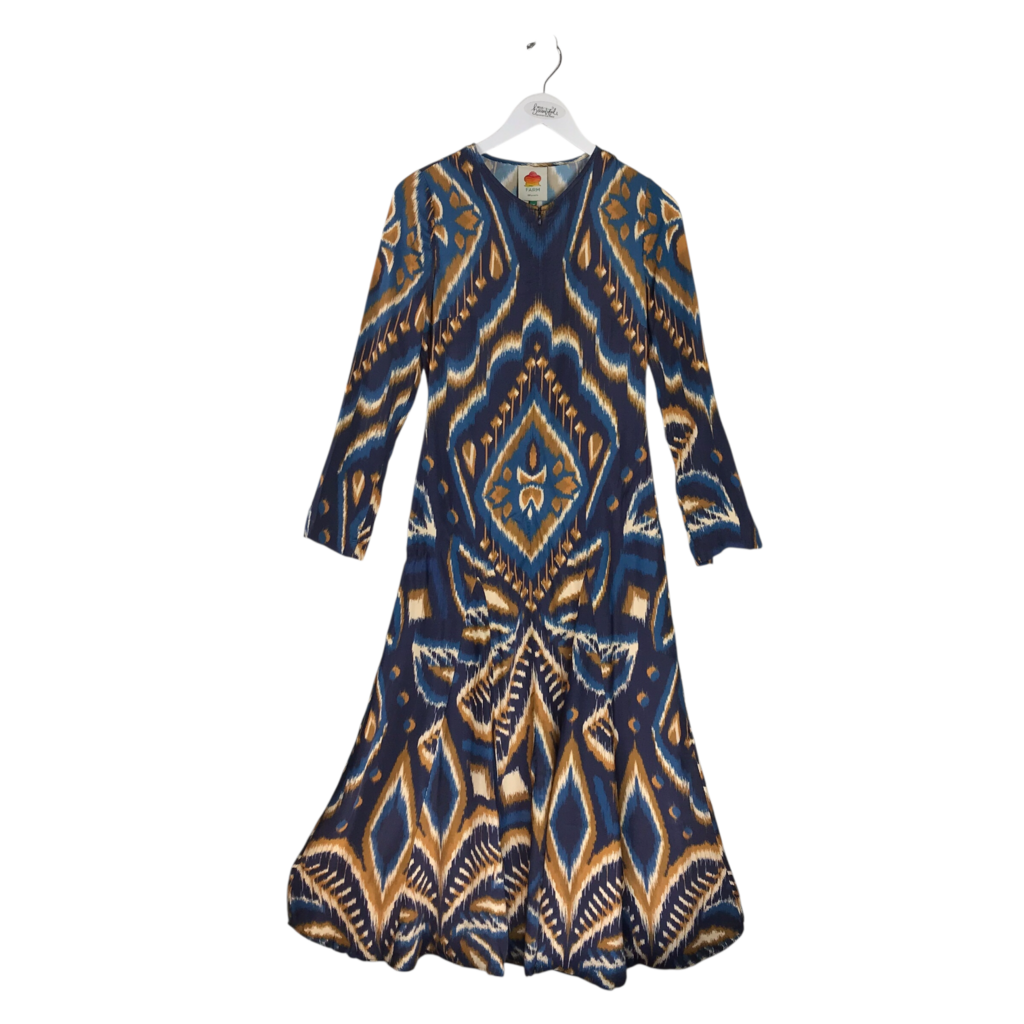 FARM RIO NWT$230 PRINT LONG SLEEVE MAXI DESIGNER DRESS BLUE TAN XSMALL