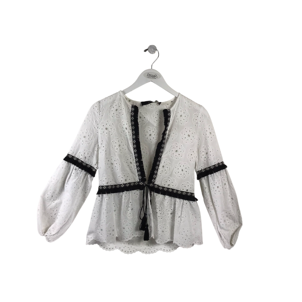 ZARA BASIC BRODERIE LONG SLEEVE BLOUSE WHITE BLACK XSMALL