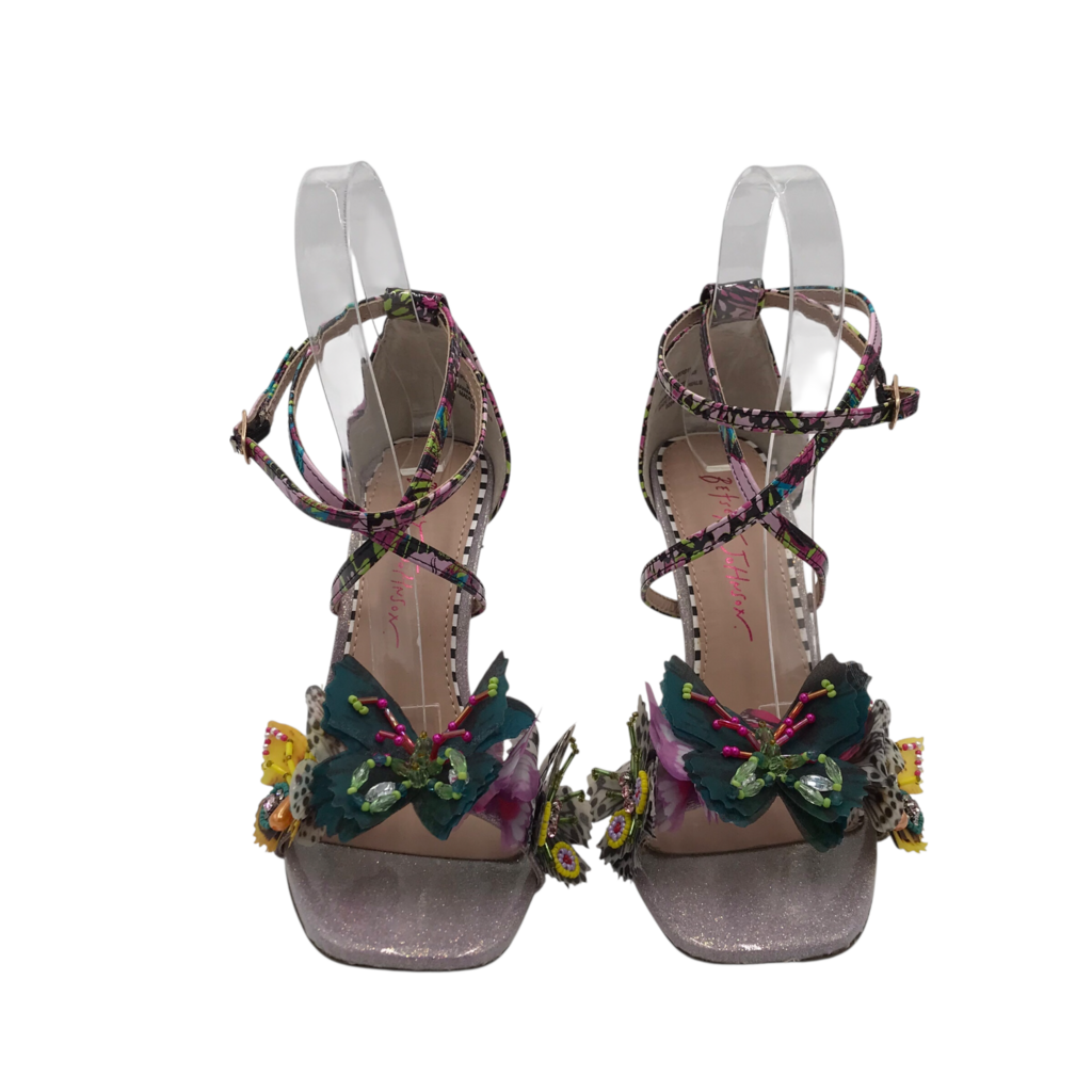 BETSEY JOHNSON ANKLE STRAP SANDAL HEEL BUTTERFLY APPLIQUE SHOES MULTI 6
