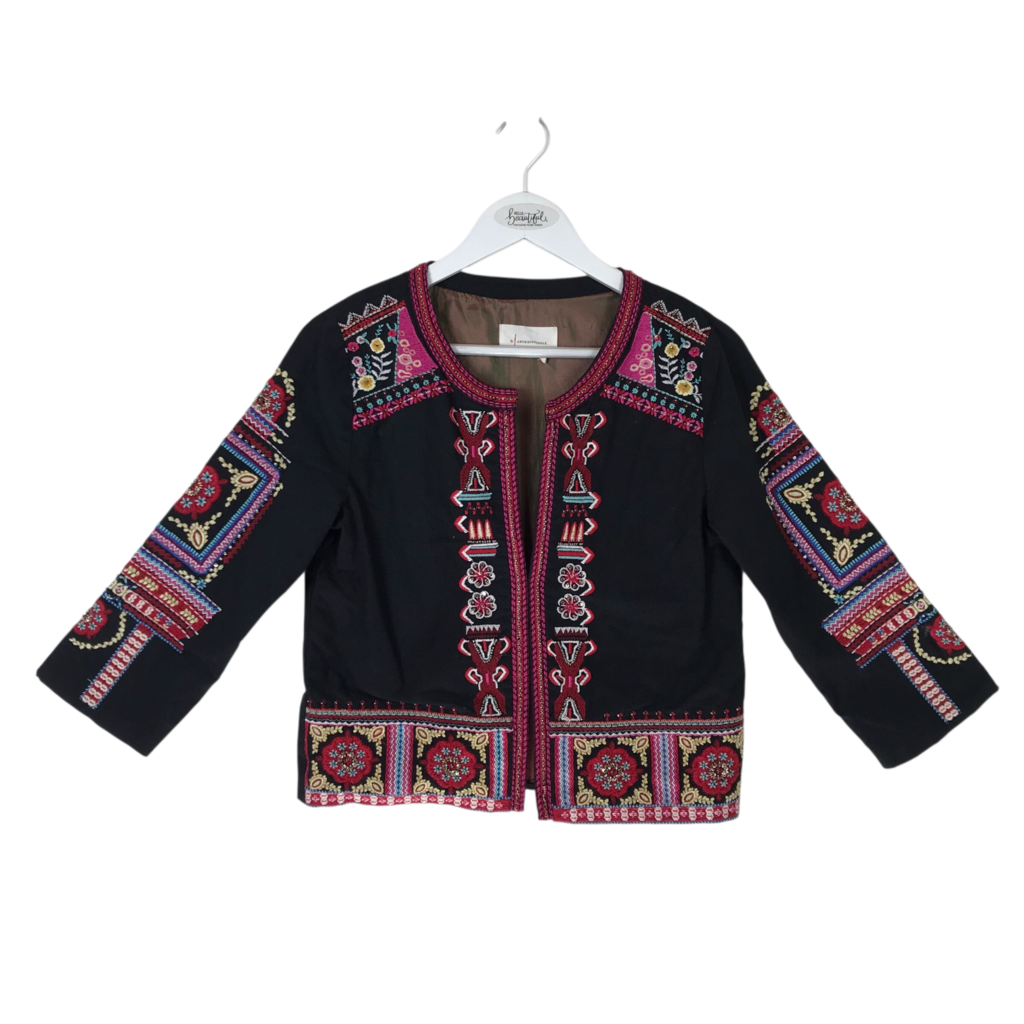 ANTHROPOLOGIE EMBROIDERED BEADS LONG BLAZER BLACK RED XS