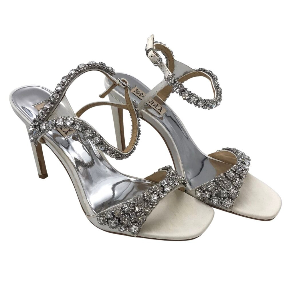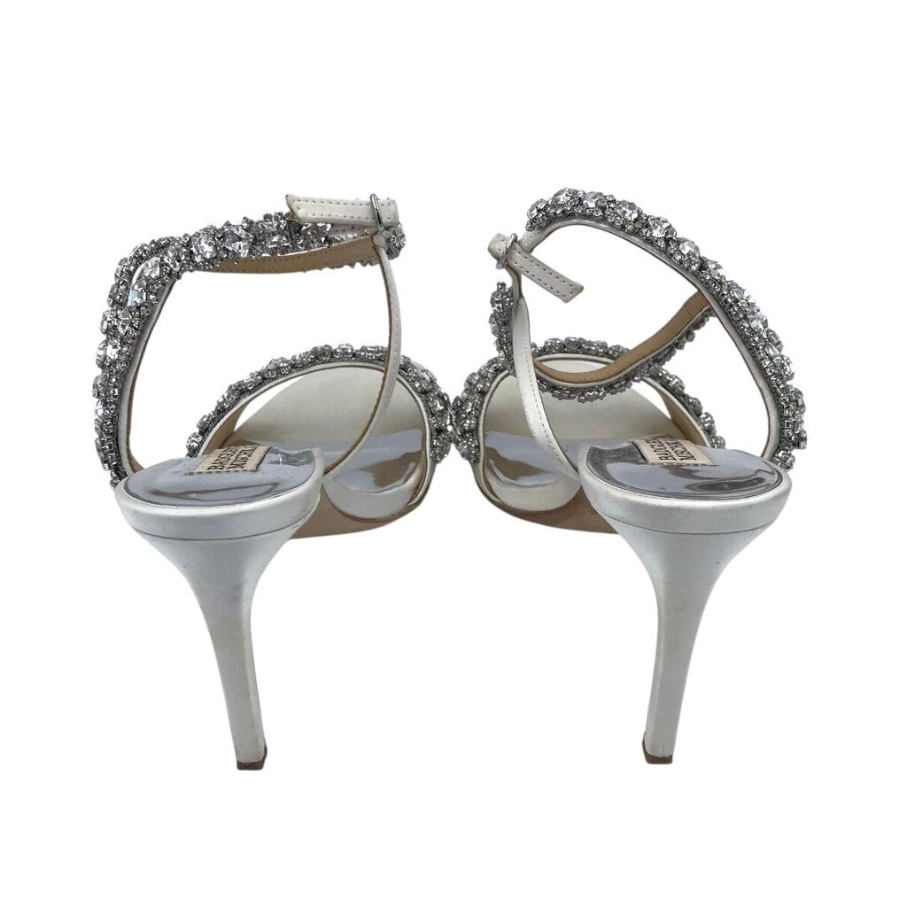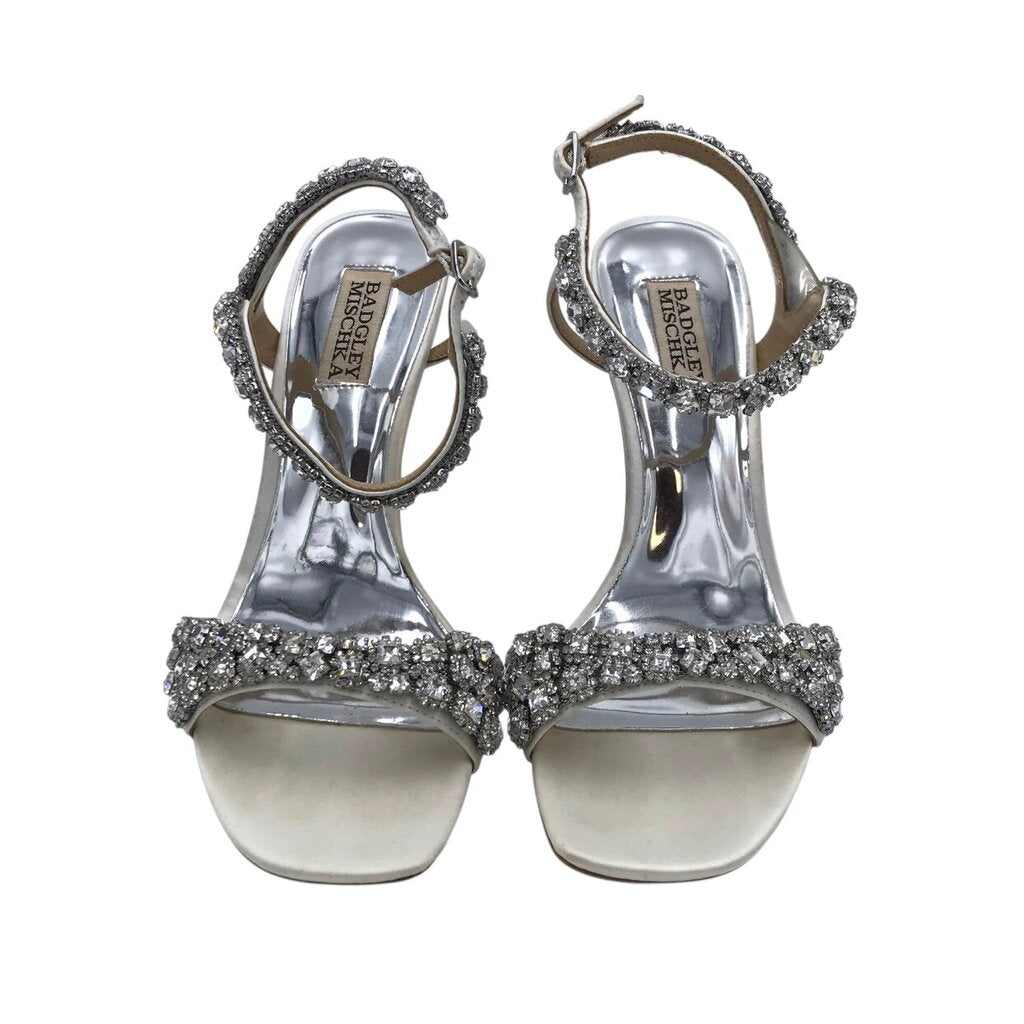 BADGLEY MISCHKA RET$255 RHINESTONE HEEL ANKLE STRAP SHOES SILVER 7.5