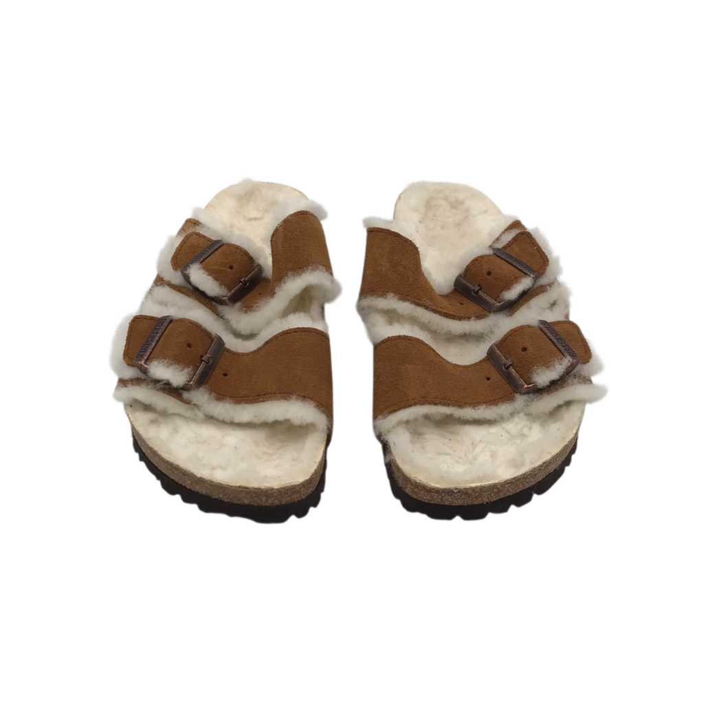 BIRKENSTOCK RET$165 SHERPA-LINED SUEDE SLIDE SHOES BROWN WHITE 8