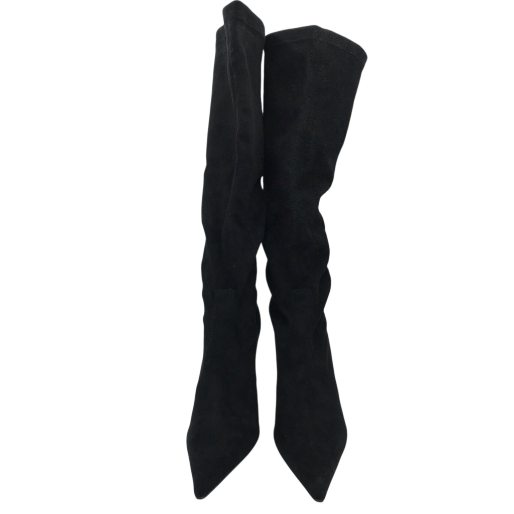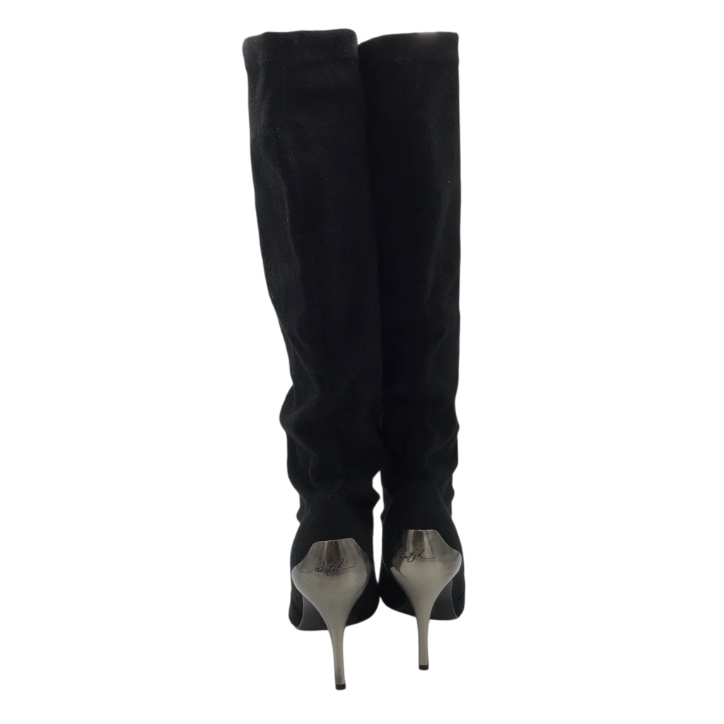 DONALD J PLINER SILVER HEEL KNEE DESIGNER BOOTS BLACK SILVER 8.5