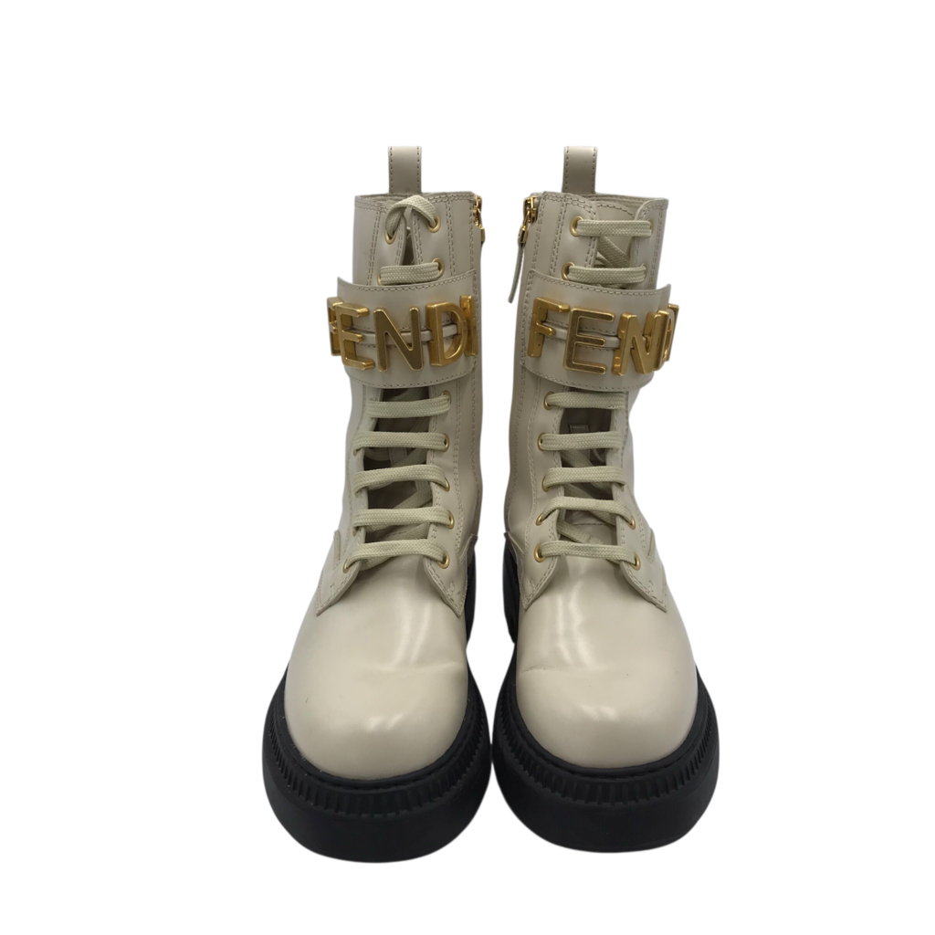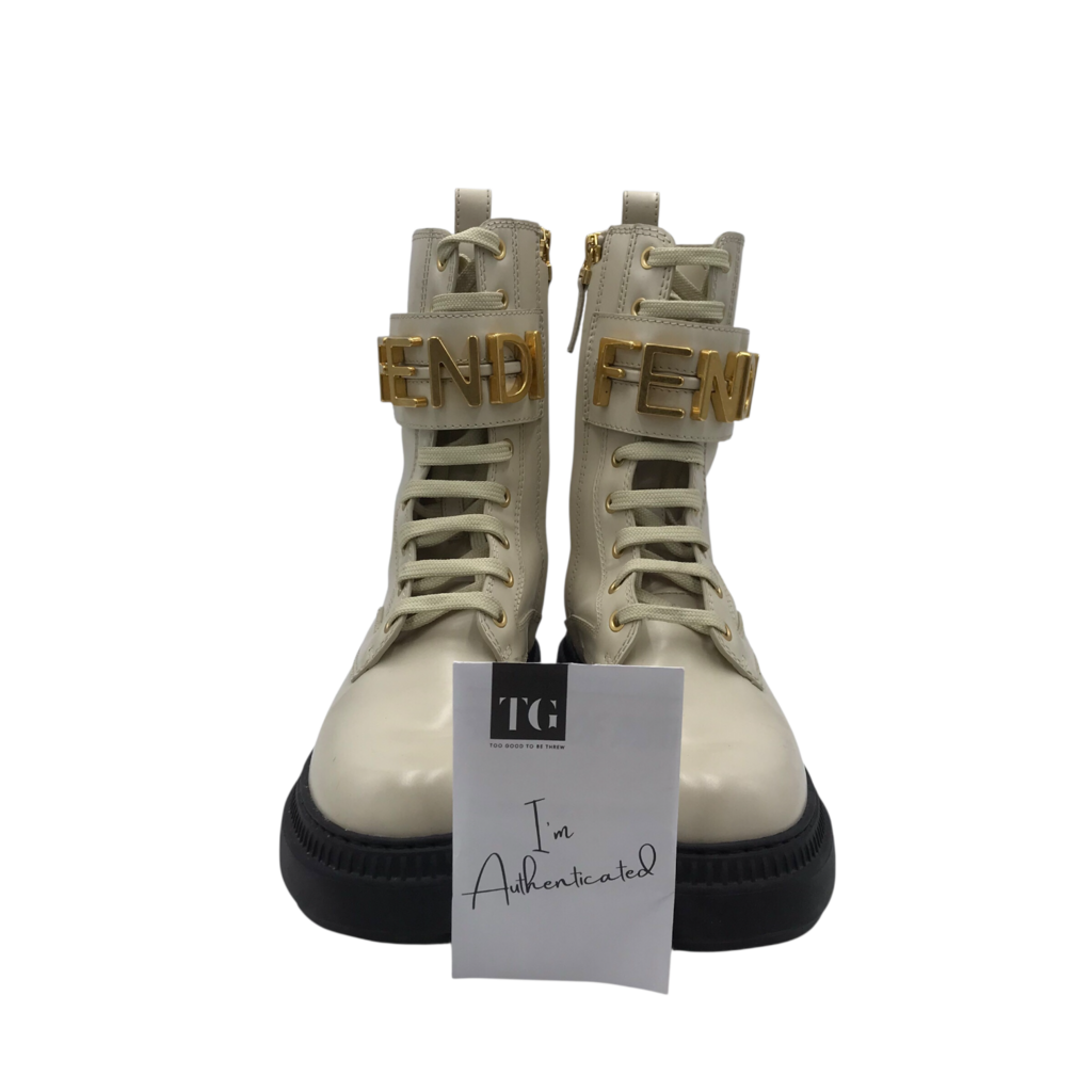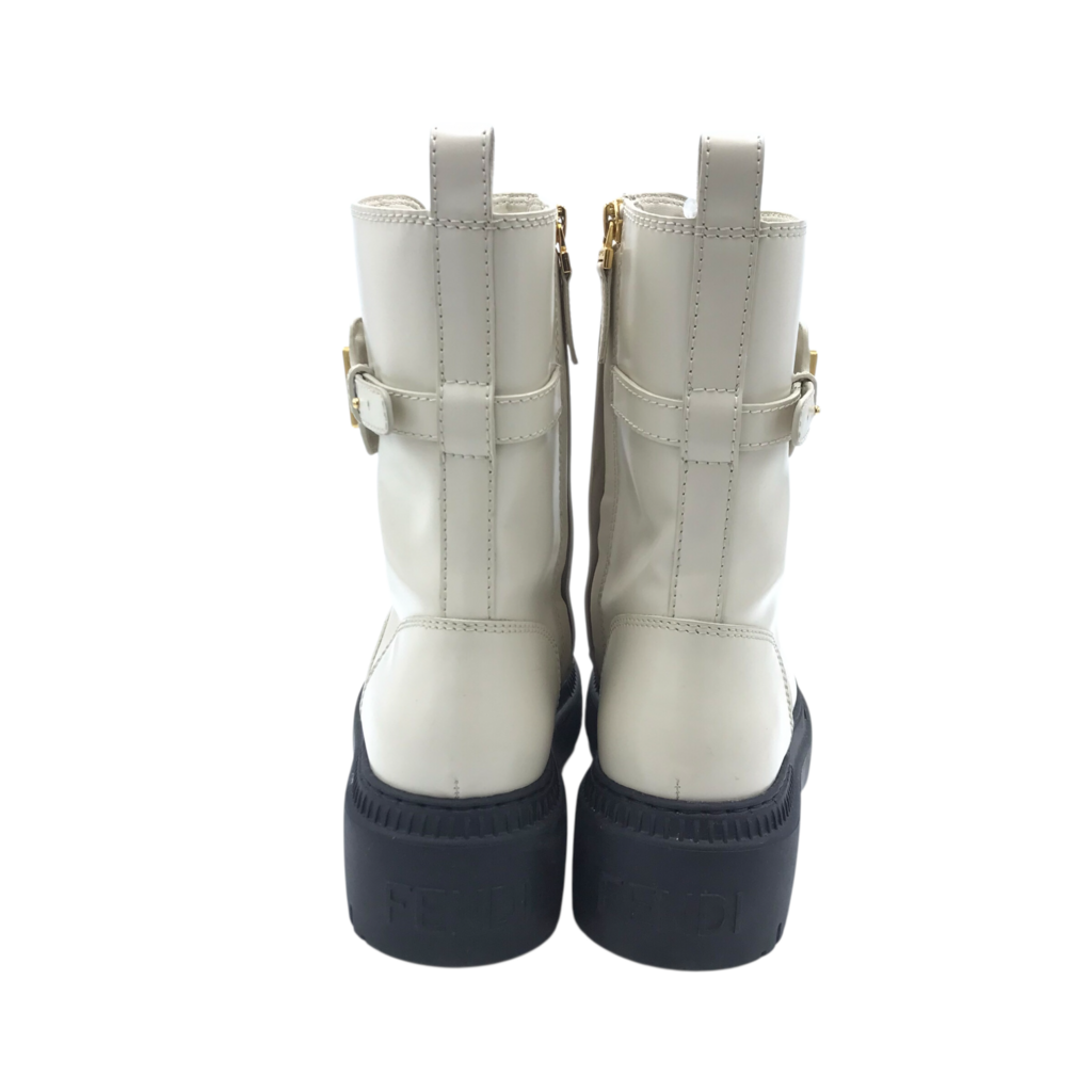 FENDI RET: $1590 LEATHER BIKER "FENDIGRAPHY" LUXE BOOTS BEIGE 37