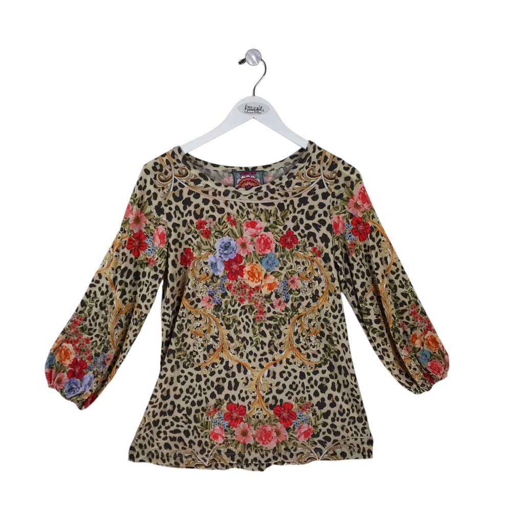 JOHNNY WAS PRINT LONG SLEEVE DESIGNER TOP CREME RED XSMALL
