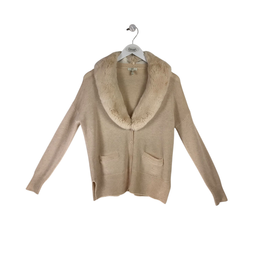 JOIE WOOL/CASHMERE DETACHABLE RABBIT FUR COLLAR LONG SLEEVE DESIGNER CARDIGAN BEIGE XSMALL