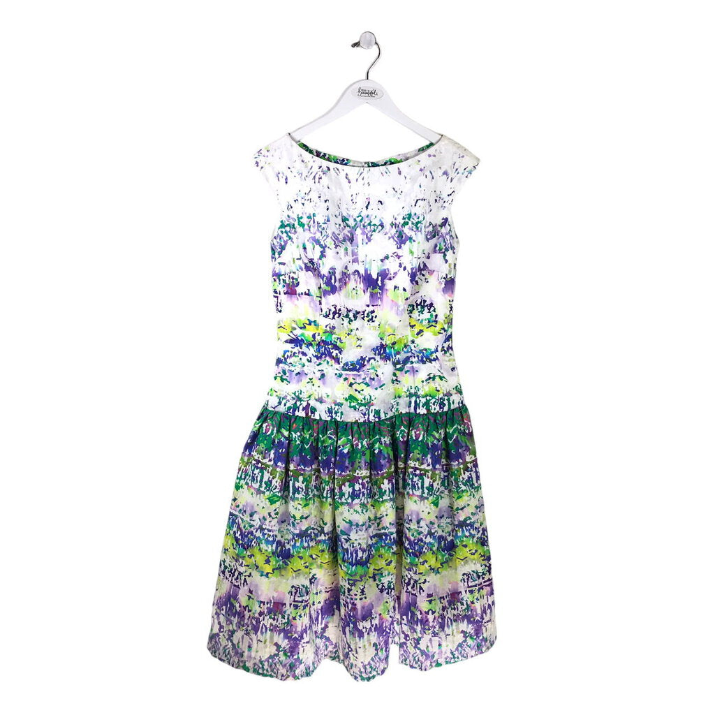 LALLA BEE RET $530 FLORAL CAP SLEEVE DESIGNER DRESS WHITE PURPLE 6