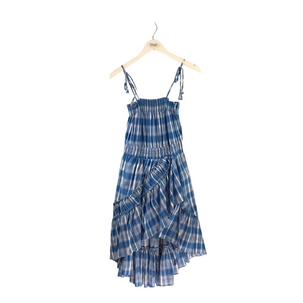 MISA RET$490 PLAID HI LOW DESIGNER DRESS BLUE WHITE MEDIUM