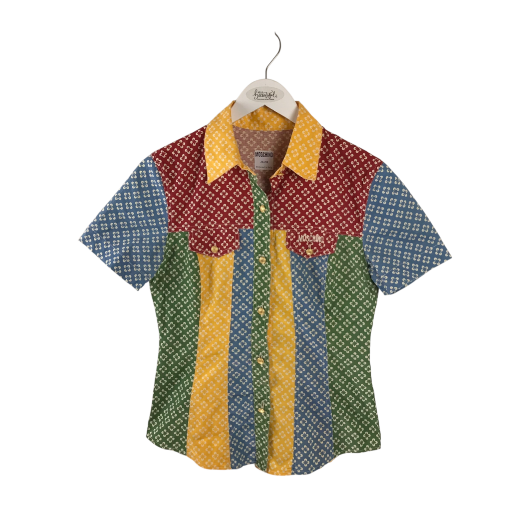 MOSCHINO PRINT COLORBLOCK SHORT SLEEVE DESIGNER BLOUSE RED YELLOW MEDIUM