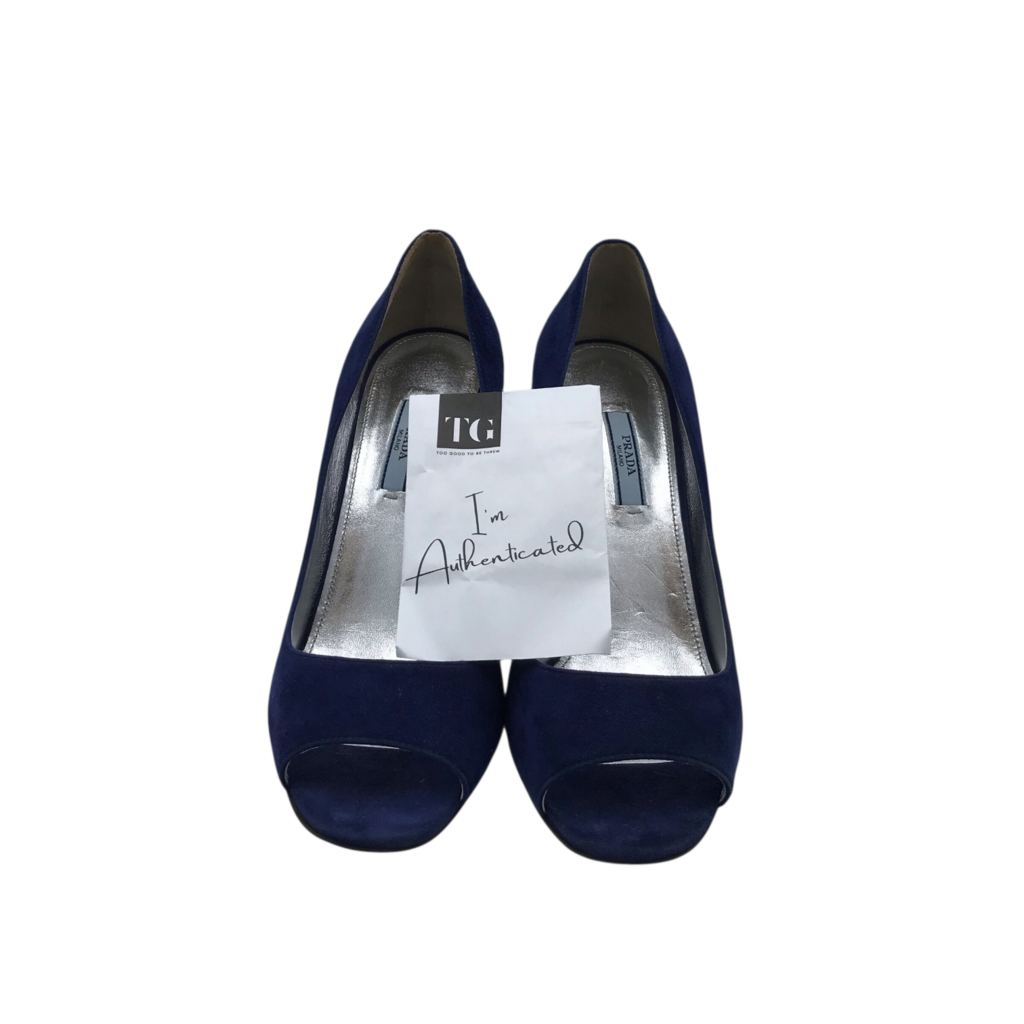 PRADA SUEDE PEEP-TOE PUMPS LUXE SHOES NAVY `40