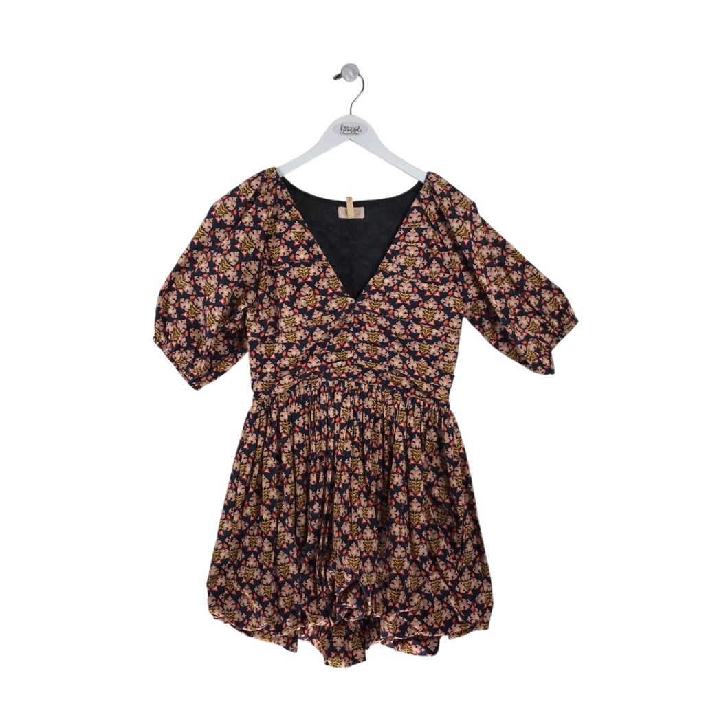 PRINT PUFF SLEEVE DESIGNER DRESS NAVY PEACH MEDIUM