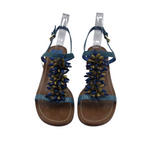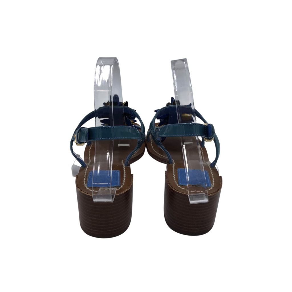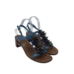TORY BURCH BEADED BLOCK HEEL SANDAL DESIGNER SHOES BLUE BROWN 8M