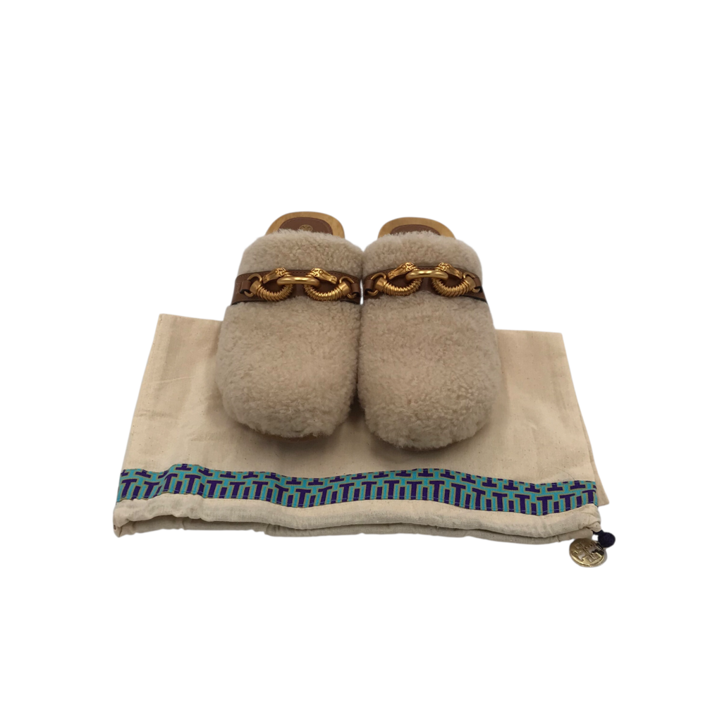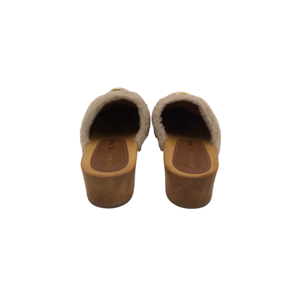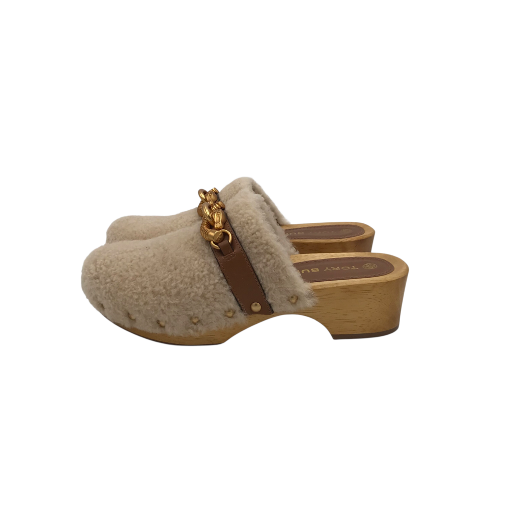 TORY BURCH SHEARLING CLOG DESIGNER SHOES CREAM BROWN 7