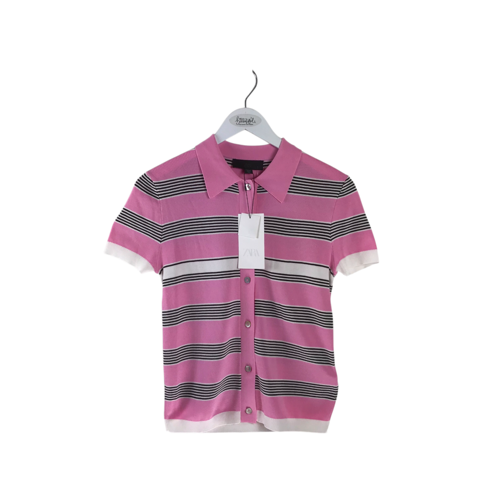 ZARA STRIPE SHORT SLEEVE CARDIGAN PINK WHITE SMALL